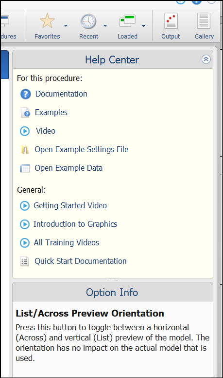 The Help Center was re-configured for the three primary windows (home, procedure, and output). It is now separated from the Option Info area and functions as a drop-down.